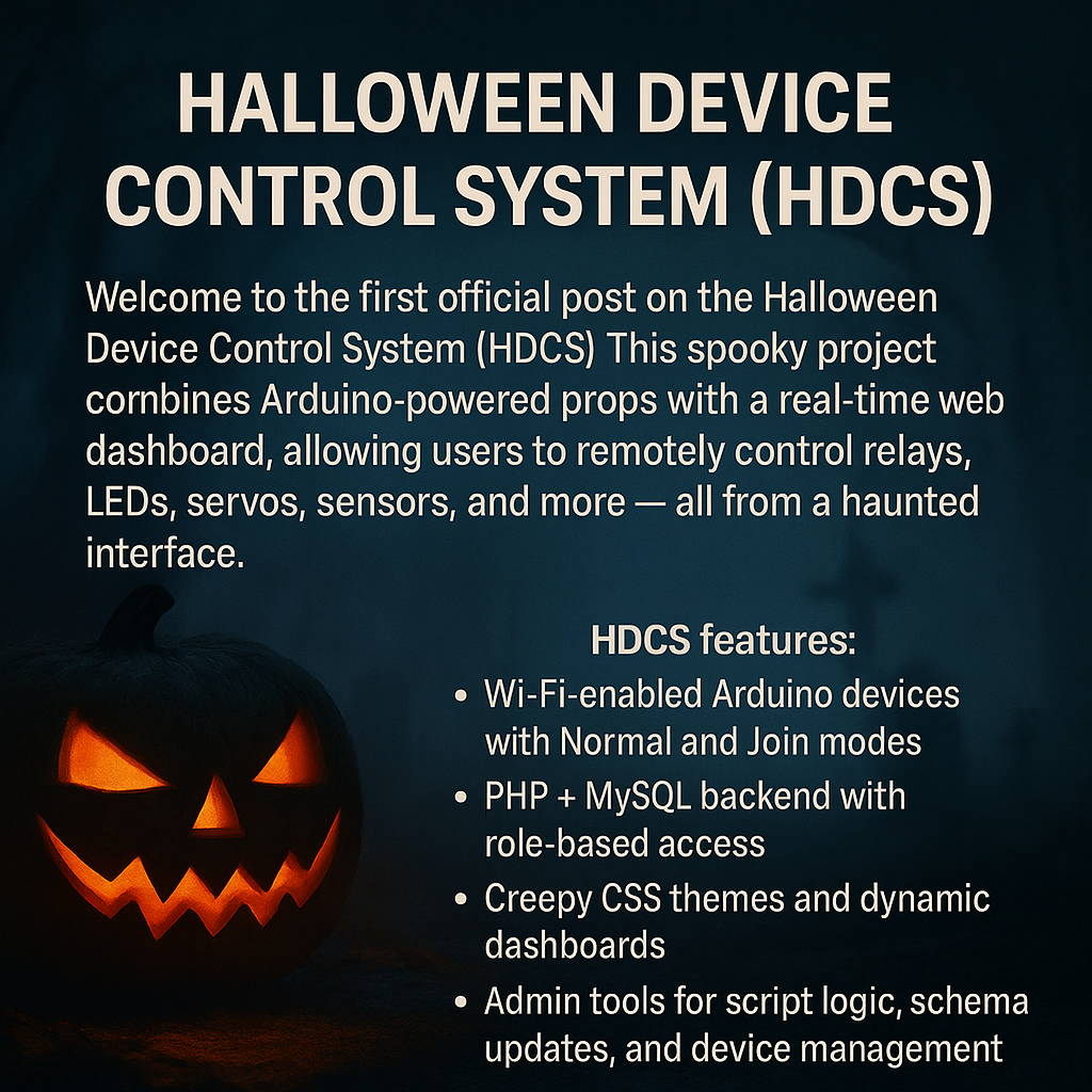 Welcome to the first official post on the Halloween Device Control System (HDCS)! This spooky project combines Arduino-powered props with a real-time web dashboard, allowing users to remotely control relays, LEDs, servos, sensors, and more — all from a haunted interface. HDCS features: - Wi-Fi-enabled Arduino devices with Normal and Join modes - PHP + MySQL backend with role-based access - Creepy CSS themes and dynamic dashboards - Admin tools for script logic, schema updates, and device management We’re starting with foundational infrastructure but aiming to build the most customizable haunted control platform out there. Stay tuned for spine-chilling progress!