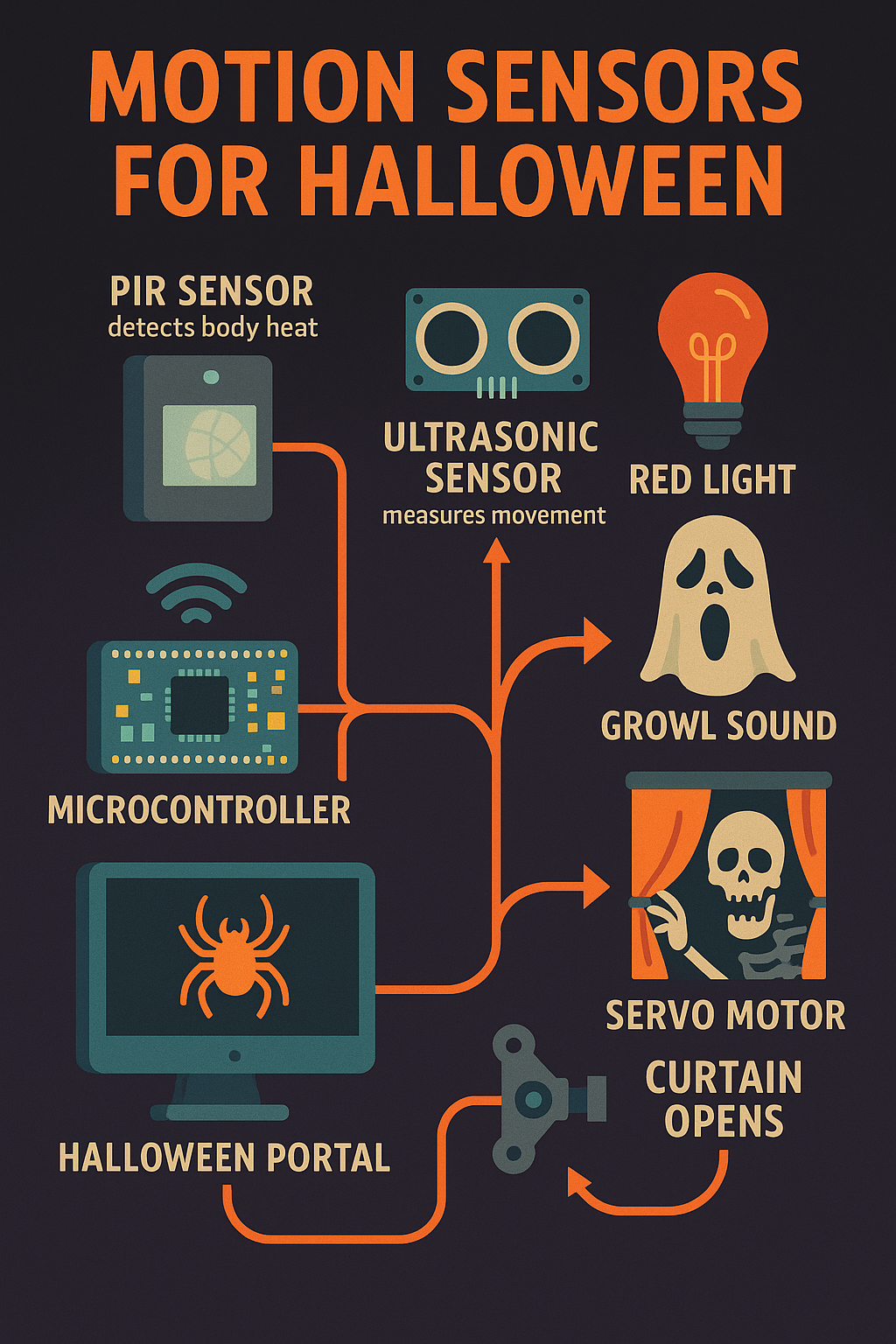 Motion sensors are one of the most versatile tools in your Halloween toolkit. They bring your haunt to life by reacting to visitors in real time. When used properly, they allow for subtle ambiance shifts or full-on jump scares that activate precisely when your guest is vulnerable. There are different types of sensors available: PIR (Passive Infrared) sensors detect body heat, while ultrasonic sensors measure movement by bouncing sound waves. PIR sensors are great for tight corridors and entry points, while ultrasonic is better for larger or irregular zones. Connect your sensor to a microcontroller (like an ESP8266 or Arduino) and register it in your Halloween Portal dashboard. You can then assign scripts to activate when the sensor is triggered. For example, you might program a script to activate a red light, followed by a growl sound and a servo motor pulling open a curtain. Staggering events like this builds tension and makes the experience more dynamic. Avoid false positives by angling the sensor away from pets, trees, or constant traffic. Add a cool-down time so your devices don’t re-trigger too fast. With thoughtful placement and scripting, motion sensors can turn a static display into an interactive haunted journey.