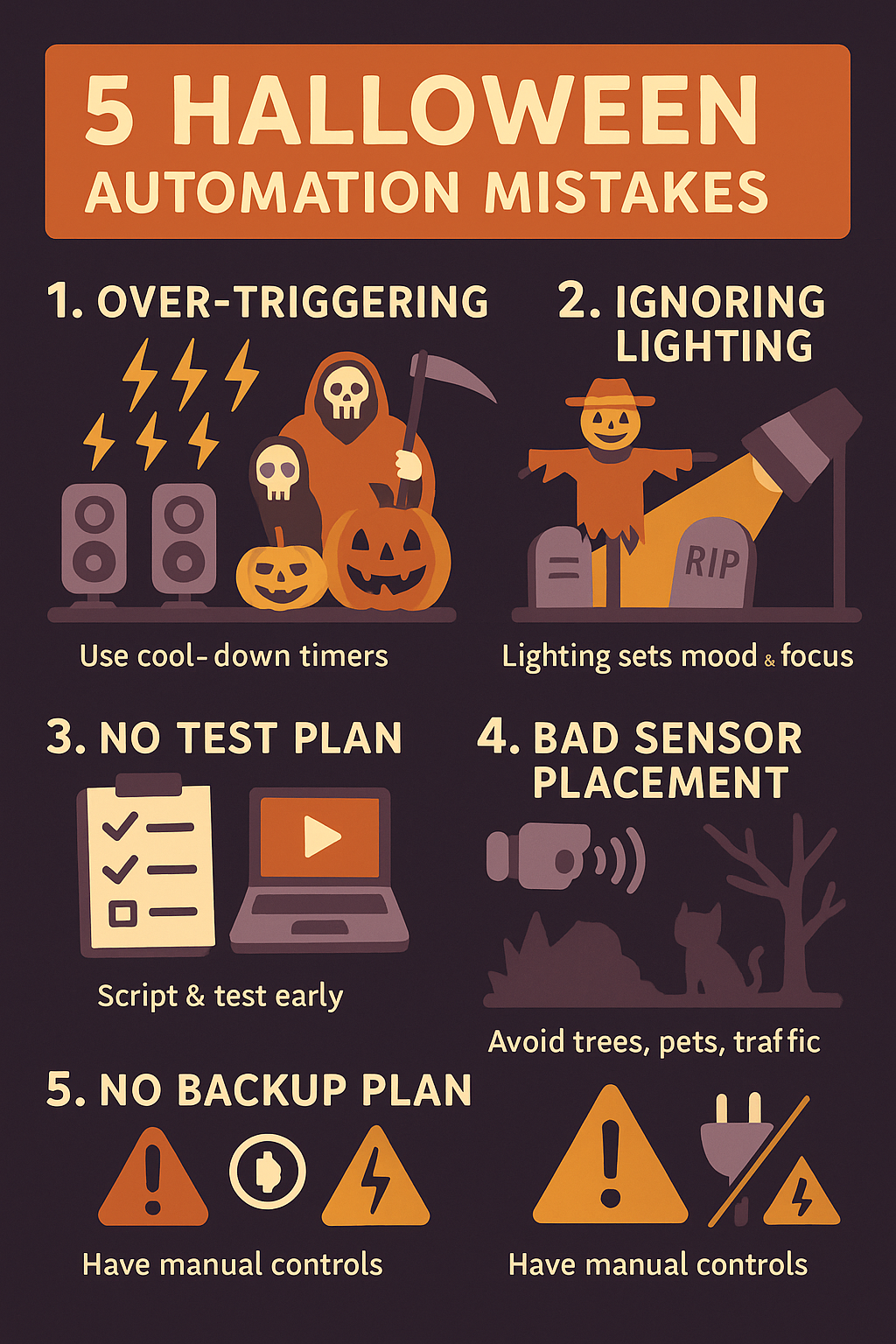 Halloween automation is exciting, but even seasoned haunters can make mistakes that weaken the impact or break the immersion. Here are the top 5 mistakes—and how to avoid them. **1. Over-triggering**: Devices that activate too often become predictable. Use cool-down timers or logic conditions to keep things scary but not spammy. **2. Ignoring lighting**: Many focus on props and forget the lighting. Lighting sets mood and focus. Without it, scares lose impact. **3. No test plan**: Testing during setup night is too late. Script and test each sequence in advance. Use the preview mode and logs in the Portal. **4. Bad sensor placement**: Motion sensors near trees, pets, or traffic cause false positives. Mount them carefully, and test under real-world conditions. **5. No backup plan**: Power loss, WiFi issues, or device failure happen. Have a manual control or default state for each prop. Avoiding these mistakes means your automation will be more reliable, more immersive, and less stressful to maintain. Planning ahead ensures your guests enjoy the fright — and you enjoy the night.