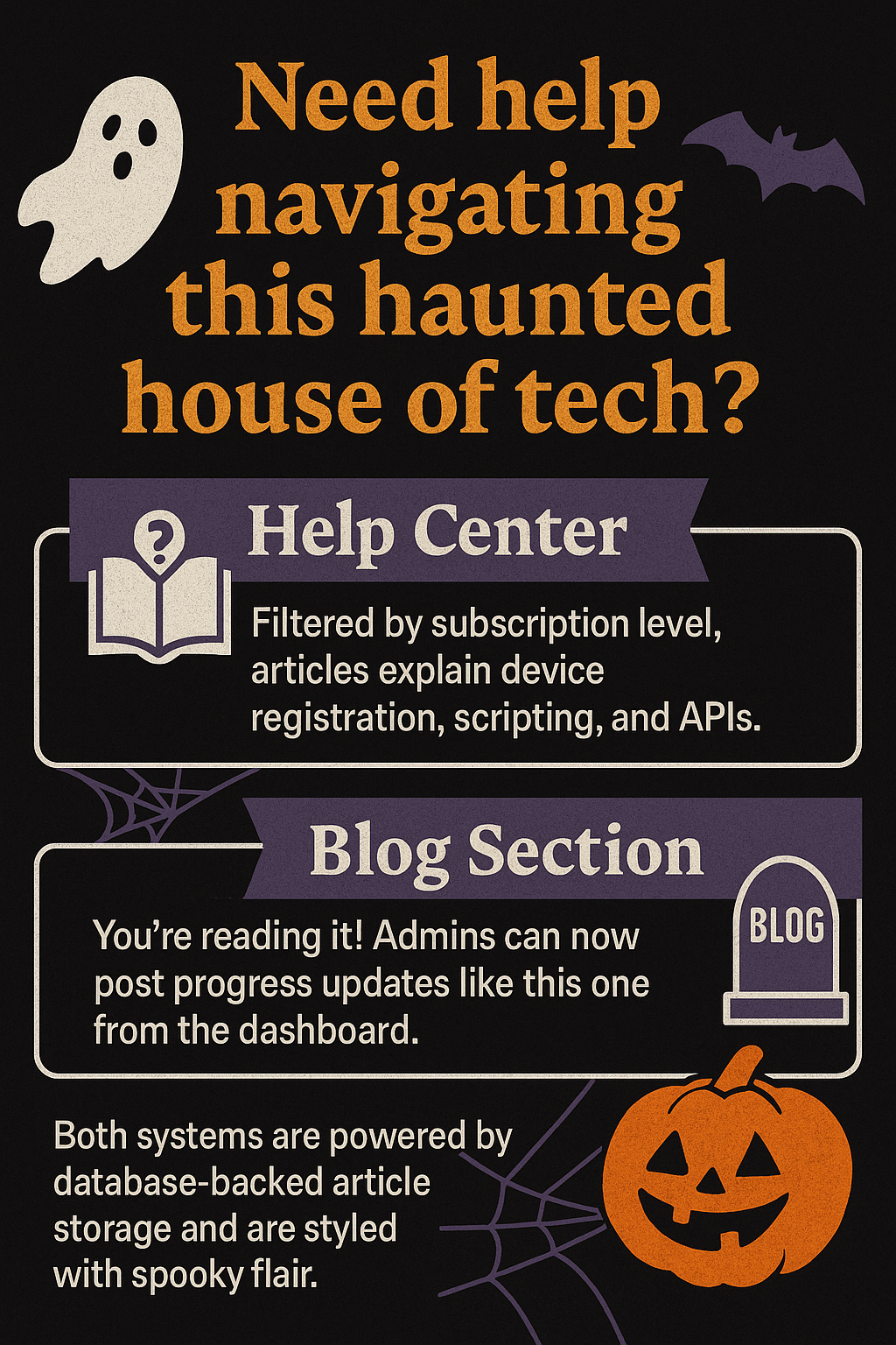 Need help navigating this haunted house of tech? We’ve launched two new features: - Help Center: Filtered by subscription level, articles explain device registration, scripting, and APIs. - Blog Section: You’re reading it! Admins can now post progress updates like this one from the dashboard. Both systems are powered by database-backed article storage and are styled with spooky flair.