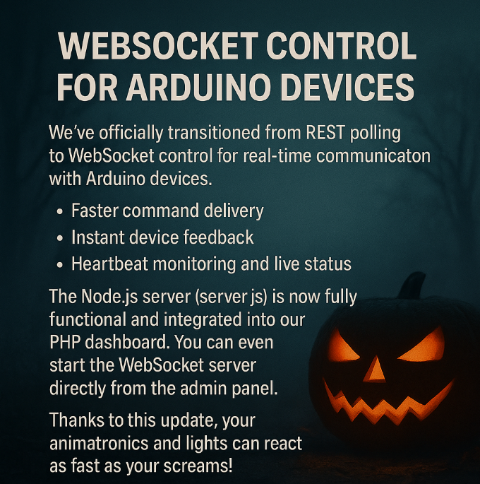 We've officially transitioned from REST polling to WebSocket control for real-time communication with Arduino devices. This means: - Faster command delivery - Instant device feedback - Heartbeat monitoring and live status The Node.js server (server.js) is now fully functional and integrated into our PHP dashboard. You can even start the WebSocket server directly from the admin panel. Thanks to this update, your animatronics and lights can react as fast as your screams!